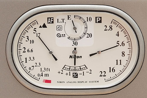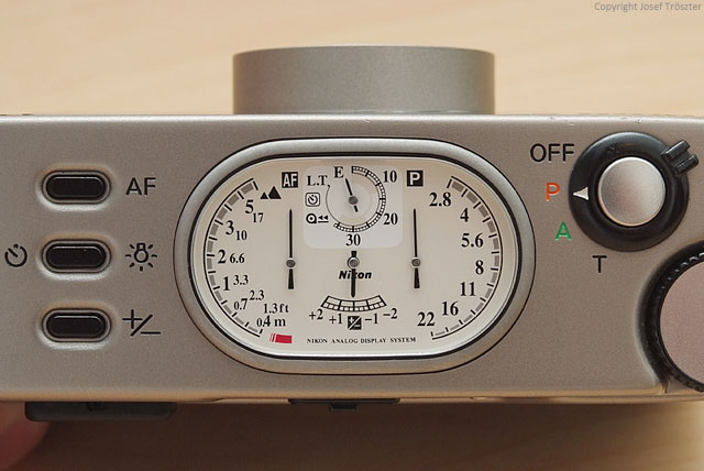 Das Bedienkonzept der Nikon 35Ti und 28Ti ist durchdacht und sehr einfach, auch wenn man für das Aufrufen einzelner Funktionen manchmal eine Taste drücken und zugleich das Wählrad drehen muß. Man ist damit zufrieden, denn die Tasten haben einen gut fühlbaren Druckpunkt und auch das Wählrad läßt eine präzise und zügige Bedienung zu. Insgesamt gesehen könnten die Tasten größer sein, aber das ist ein Manko vieler Kompaktkameras und eigentlich keine wirkliche Kritik. Vor allem das NADS mit seinen Zeigern ist eine sinnvolle Sache und man gewöhnt sich rasch daran, alle Daten auf einen Blick vor sich zu haben. Generell gesehen arbeitet man mit einer kleinen Kompaktkamera immer langsamer als mit einer Leica M oder einer Spiegelreflexkamera. Das geringere Volumen und Gewicht der Nikon 35Ti oder 28Ti erkauft man sich eben mit einer etwas langsameren Bedienung.