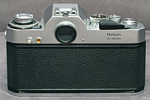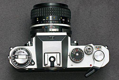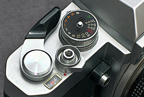Der Sucher dieser Kamera entspricht ganz genau jenem der Nikkormat EL. Eine relativ helle Mattscheibe vom Typ K mit Mikroprismenring und Schnittbildindikator ist wie bei so vielen anderen Nikons der Standard. Auf der linken Seite findet man eine Skala mit den wählbaren Belichtungszeiten und einer Position [A] für Zeitautomatik. Die Anzeige der Nachführmessung im Sucher erfolgt über einen grünen Balken, welcher die vom Benutzer eingestellte Zeit anzeigt und einem schwarzen Zeiger, der den Messwert des Belichtungsmessers darstellt. Das ist sehr übersichtlich und man kann sehr schnell den persönlich gewünschten Abgleich durchführen. Was fehlen könnte, ist die nicht vorhandene Anzeige der eingestellten Blende im Sucher aber die hat es erst ab der Nikon FM gegeben.